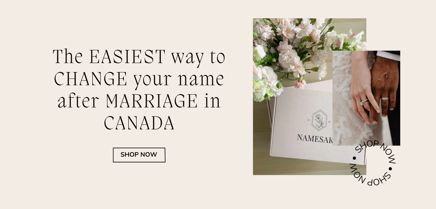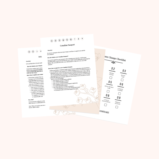 Namesake takes the guess work out of changing your last name. Each of our Namesake kits contains a personalized checklist, pre-filled documents, and step-by-step instructions based on your province, saving the average bride 10+ hours of research!